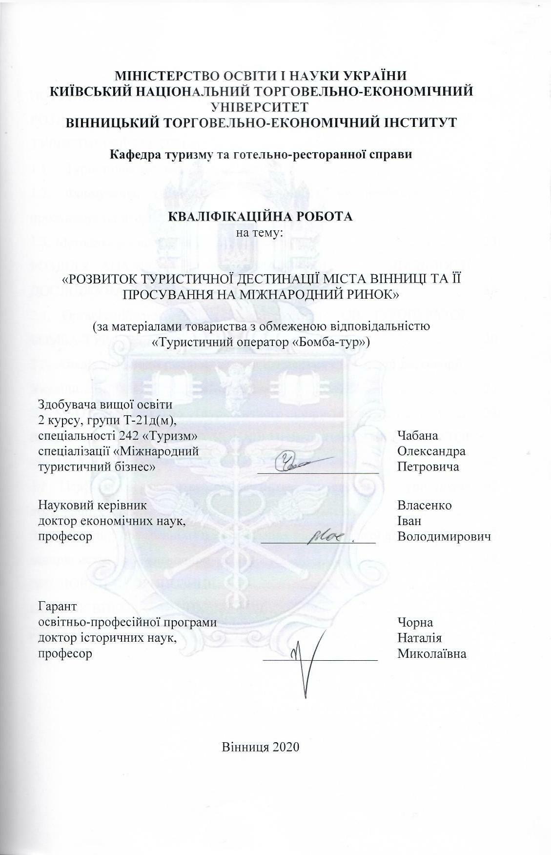 | Назва: | Розвиток туристичної дестинації міста Вінниці та її просування на міжнародний ринок (за матеріалами товариства з обмеженою відповідальністю "Туристичний оператор "Бомба-тур"") |