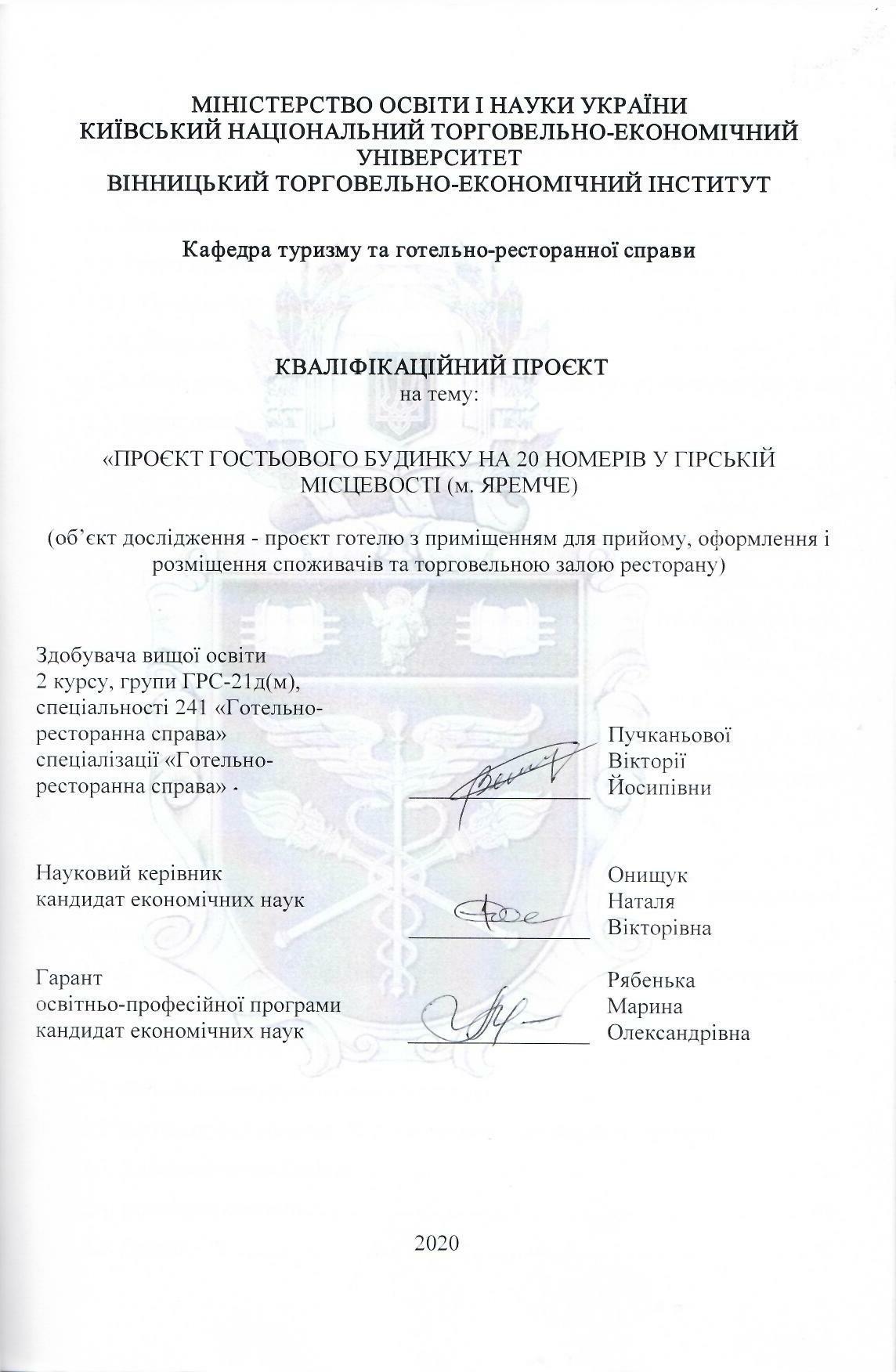 | Назва: | Проєкт гостьового будинку на 20 номерів у гірській місцевості (м. Яремче) (об'єкт дослідження - проєкт готелю з приміщеннями для прийому, оформлення і розміщення споживачів та готельною залою ресторану) |