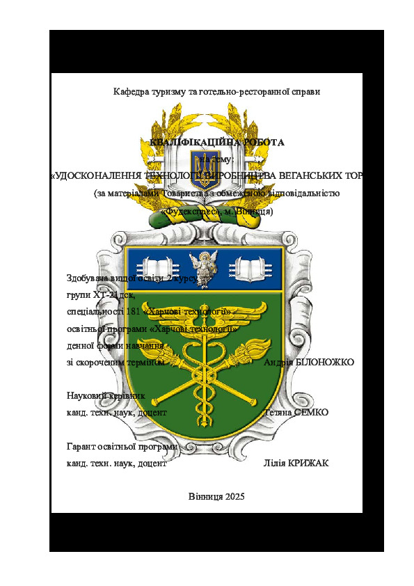 Title: | Удосконалення технології виробництва веганських тортів (за матеріалами Товариства з обмеженою відповідальністю «Фудекспрес», м. Вінниця) |