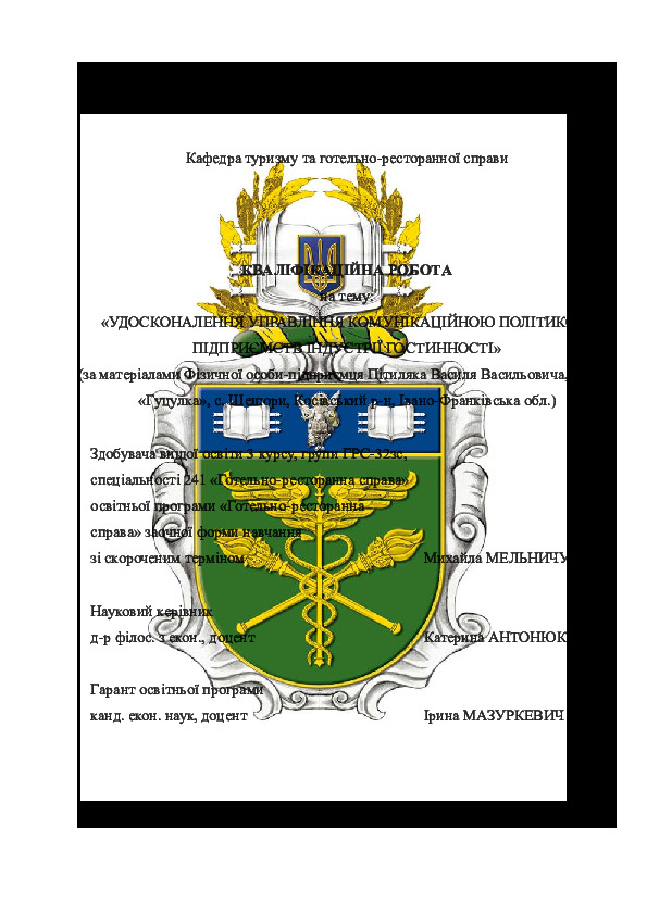 Title: | Удосконалення управління комунікаційною політикою підприємств індустрії гостинності (за матеріалами фізичної особи-підприємця Пітиляка Василя Васильовича, садиба «Гуцулка», с. Шешори, Косівський р-н, Івано-Франківська обл.) |