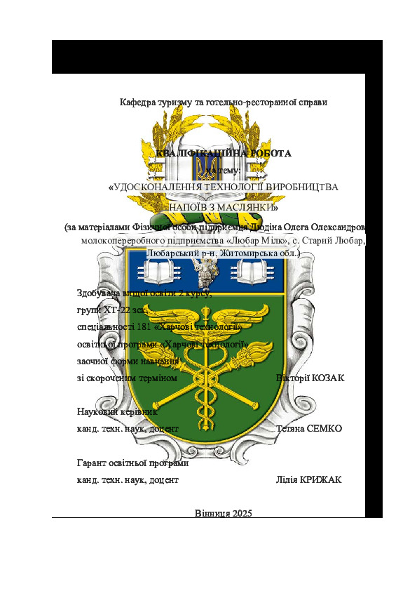 Title: | Удосконалення технології виробництва напоїв з маслянки(за матеріалами Фізичної особи підприємця Дюдіна Олега Олександровича, молокопереробного підприємства «Любар Мілк», с. Старий Любар, Любарський р-н, Житомирська обл.) |