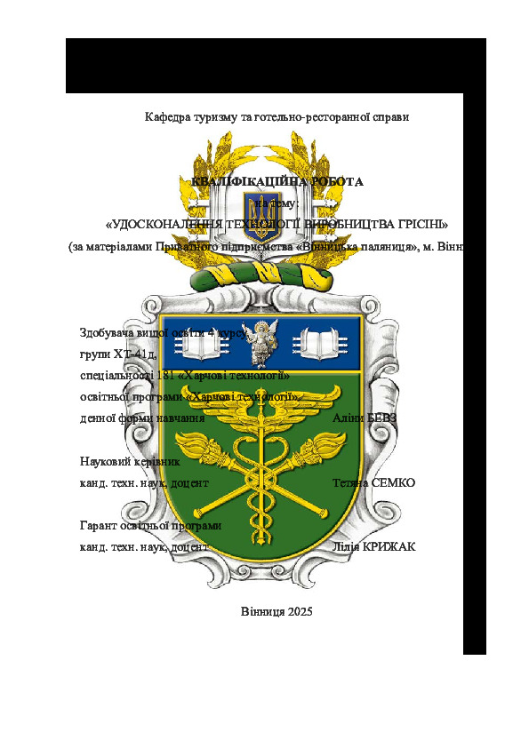 Title: | Удосконалення технології виробництва грісіні (за матеріалами Приватного підприємства «Вінницька паляниця», м. Вінниця) |