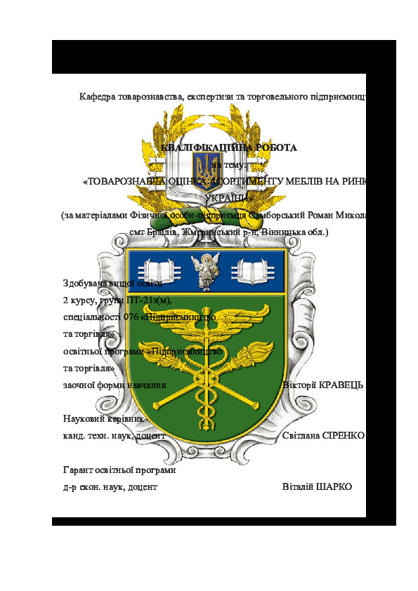 Title: | Товарознавча оцінка асортименту меблів на ринку України (за матерілами фізичної особи-підприємця Самборський Роман Миколайович, смт Браїлів, Жмеринський р-н, Вінницька обл. |