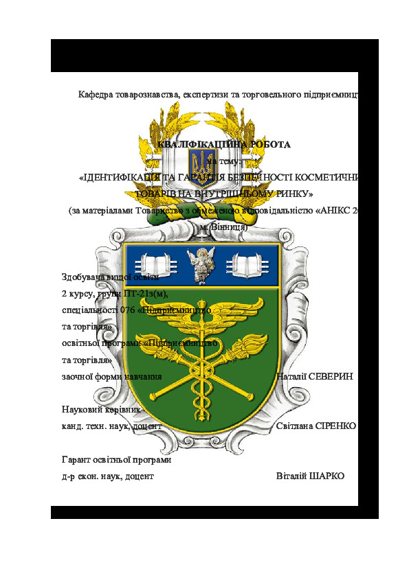 Title: | Ідентифікація та гарантія безпечності косметичних товарів на внутрішньому ринку (за матеріалами Товариства з обмеженою відповідальністю ) "АНІКС 2020", м.Вінниця |