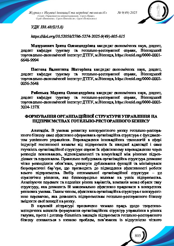 | Назва: | Формування організаційної структури управління на підприємствах готельно-ресторанного бізнесу = Developing an organizational management structure for hospitality businesses |