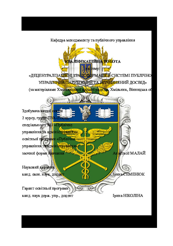 | Назва: | Децентралізаційні трансформації в системі публічного управління: зарубіжний та вітчизняний досвід (за матеріалами Хмільницької міської ради, м. Хмільник, Вінницька обл.) |