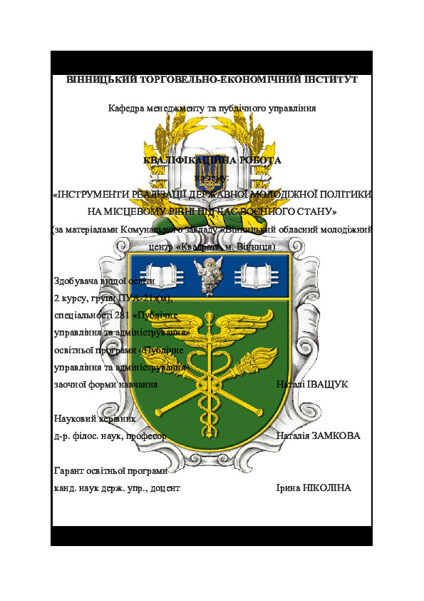 | Назва: | Інструменти реалізації державної молодіжної політики на місцевому рівні під час воєнного стану (за матеріалами комунального закладу «Вінницький обласний молодіжний центр «Квадрат», м. Вінниця) |