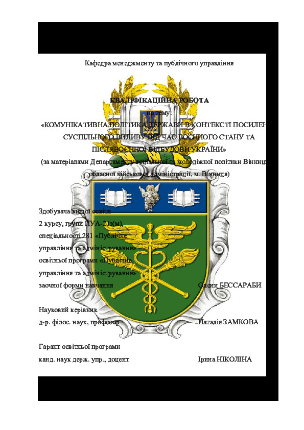| Назва: | Комунікативна політика держави в контексті посилення суспільного впливу під час воєнного стану та післявоєнної відбудови україни (за матеріалами Департаменту соціальної та молодіжної політики Вінницької обласної військової адміністрації, м. Вінниця) |