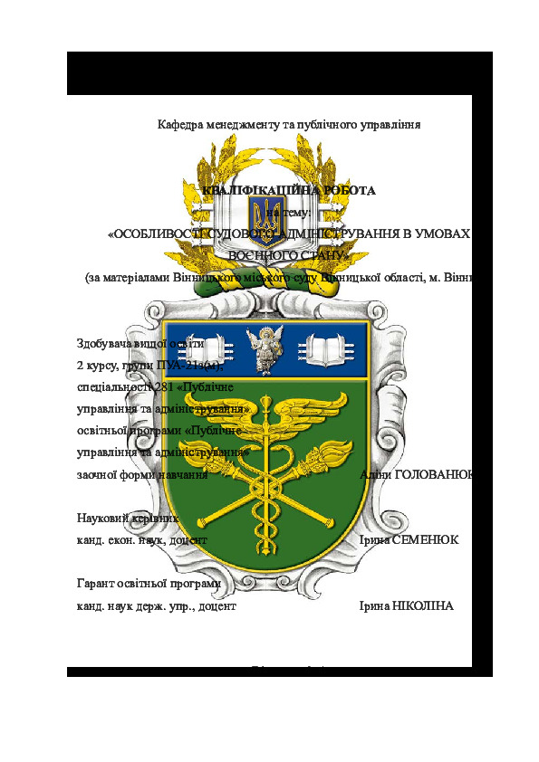 | Назва: | Особливості судового адміністрування в умовах воєнного стану (за матеріалами Вінницького міського суду Вінницької області, м. Вінниця) |