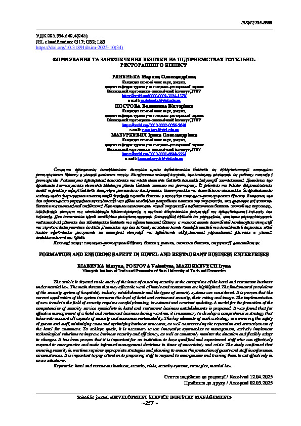 | Ключові слова: | готельно-ресторанний бізнес, безпека, ризики, системи безпеки, стратегії, воєнний стан |