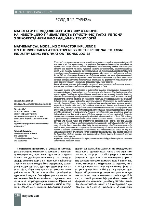 | Title: | Математичне моделювання впливу факторів на інвестиційну привабливість туристичної галузі регіону з використанням інформаційних технологій |