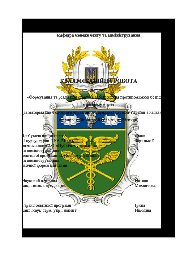 | Title: | Формування та реалізація стратегії забезпечення протипожежної безпеки на місцевому рівні» (за матеріалами ГУ ДСНС у Вінницькій області, м. Вінниця) |