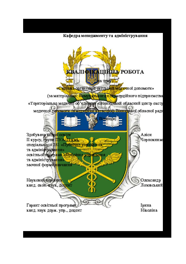 | Title: | Система організації екстреної медичної допомоги(за мат.КНП «ТМО «Вінницький обл.центр екстреної медичної допомоги та медицини катастроф Вінницької обласної ради») |