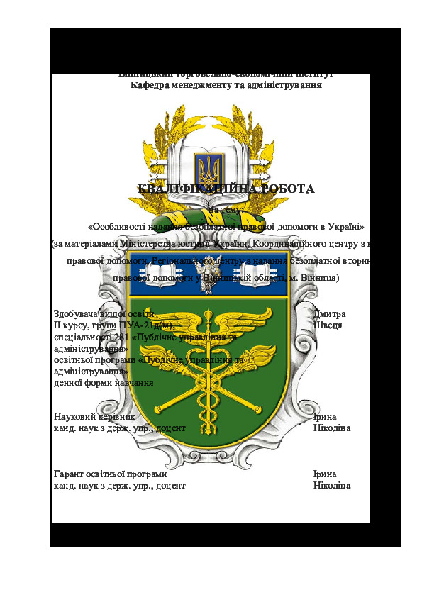 Title: | Особливості надання безоплатної правової допомоги в Україні»(за мат. Регіон.центру з надання безопл. вторинної правової допомоги у Вінницькій обл) |
