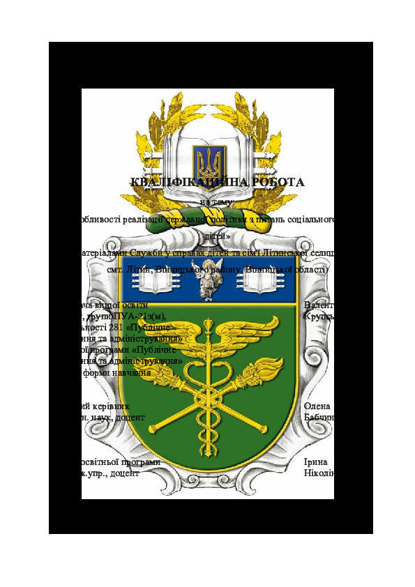 Title: | Особливості реалізації державної політики з питань соціального захисту дітей (за матеріалами Служби у справах дітей та сім`ї Літинської селищної ради, смт. Літин, Вінницького району, Вінницької області) |