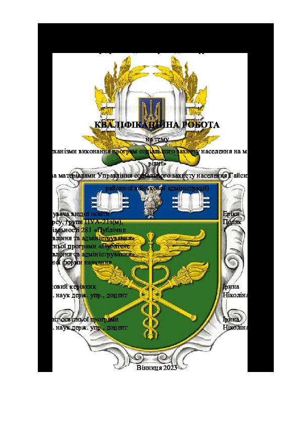 Title: | Механізми виконання програм соціального захисту населення на місцевому рівні (за матеріалами Управління соціального захисту населення Гайсинської районної військової адміністрації) |
