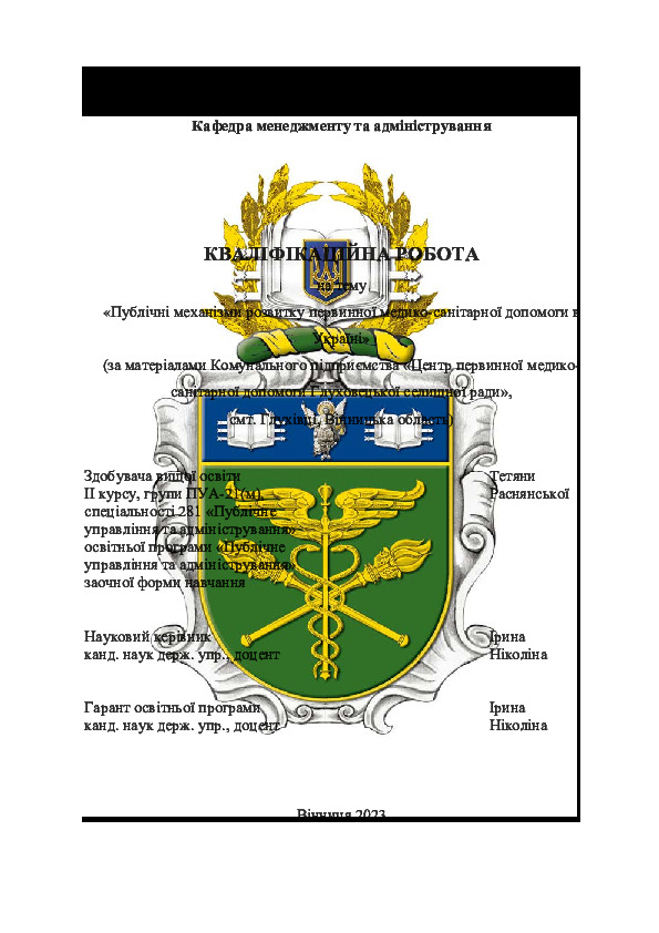 Title: | Публічні механізми розвитку первинної медико-санітарної допомоги в Україні (за матеріалами Комунального підприємства «Центр первинної медико-санітарної допомоги Глуховецької селищної ради», смт. Глухівці, Вінницька область) |