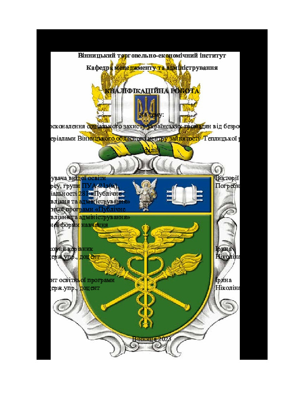 Title: | Вдосконалення соціального захисту українських громадян від безробіття (за матеріалами Вінницького обласного центру зайнятості Теплицької районної філії) |