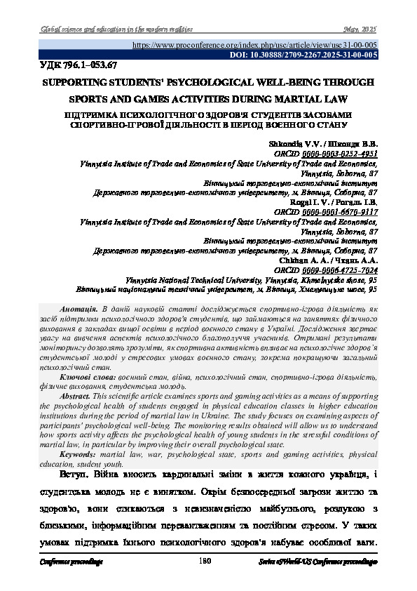 | Title: | Підтримка психологічного здоров’я студентів засобами спортивно-ігрової діяльності в період воєнного стану = Supporting students' psychological well-being through sports and games activities during martial law |
