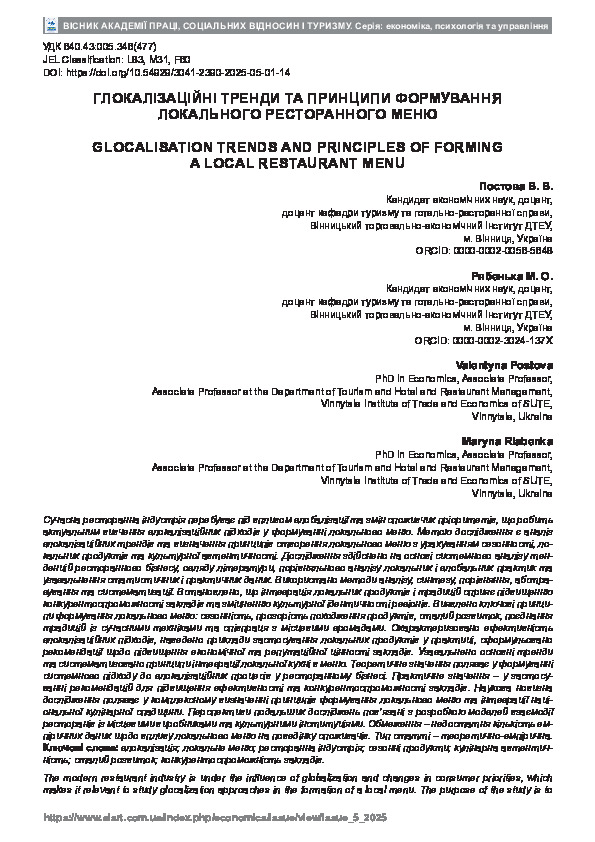 | Keywords: | глокалізація; локальне меню; ресторанна індустрія; сезонні продукти; кулінарна автентичність; сталий розвиток; конкурентоспроможність закладів. |