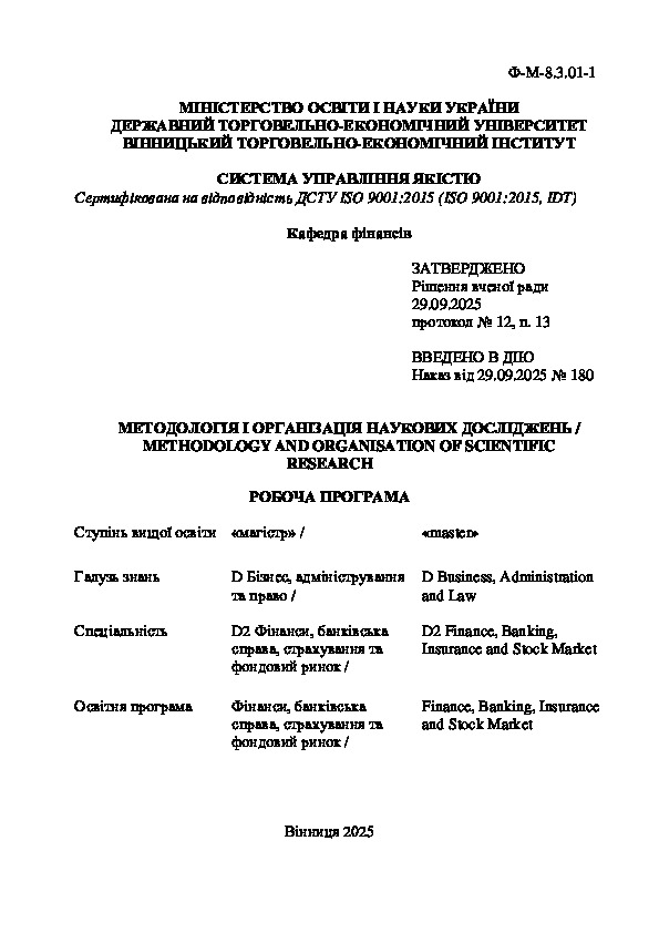 | Publication: | : робоча програма. Вінниця : Редакційно-видавничий відділ ВТЕІ ДТЕУ, 2025. 21 с. |