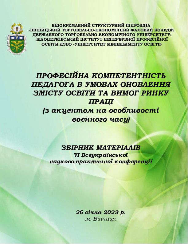 | Publication: | Професійна компетентність педагога в умовах оновлення змісту освіти та вимог ринку праці (з акцентом на особливості воєнного часу) : Матер. VІ Всеукр. наук.-практ. конф., 26 січня 2023 р., Вінниця. Вінниця : ВСП «ВТЕФК ДТЕУ», ТОВ «Вінницька міська друкарня», 2023. С. 30–33 |