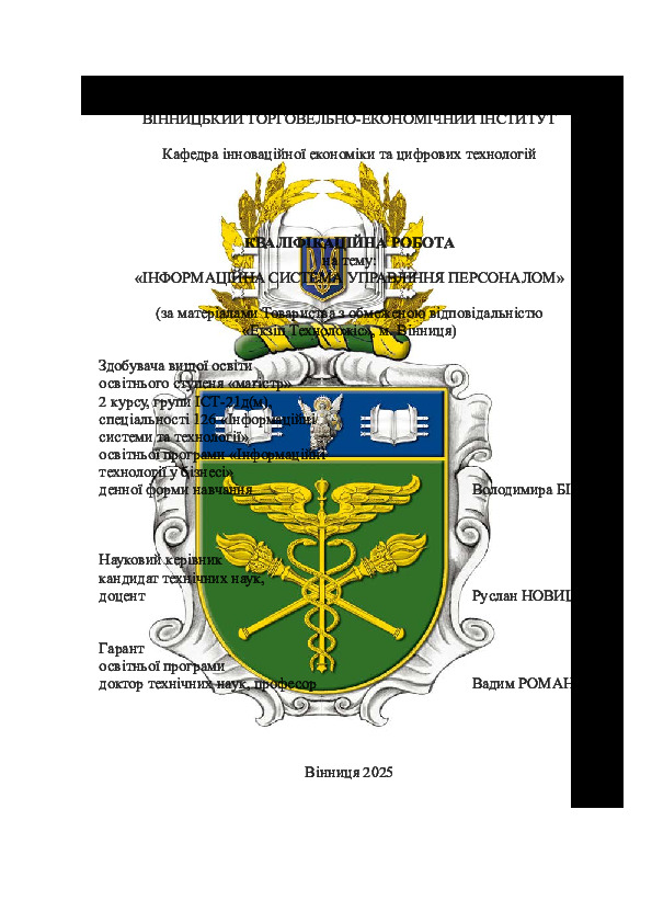 | Title: | Інформаційна система управління персоналом (за матеріалами Товариства з обмеженою відповідальністю «Екзіп Техноложіс», м. Вінниця) |