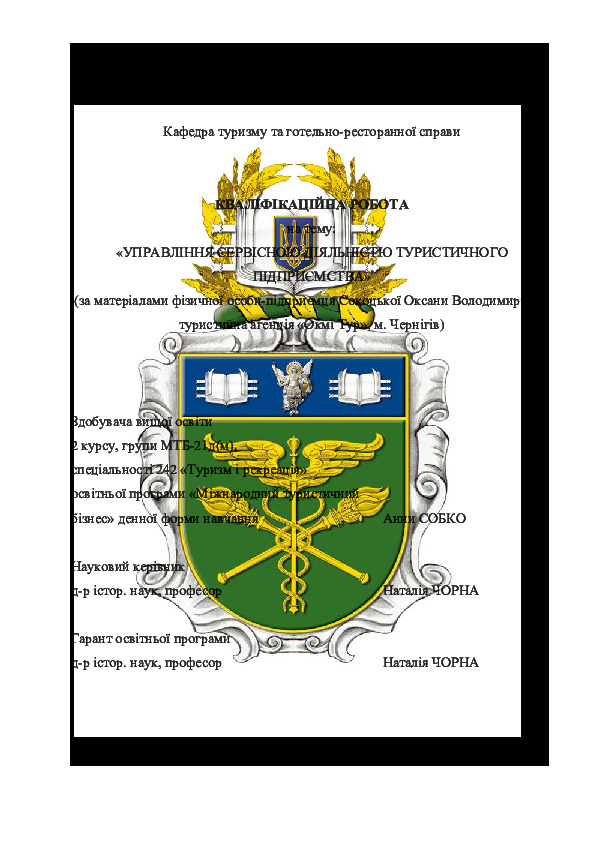 | Title: | Управління сервісною діяльністю туристичного підприємства (за матеріалами фізичної особи-підприємця Сокоцької Оксани Володимирівни, туристична агенція «Окмі Тур», м. Чернігів) |