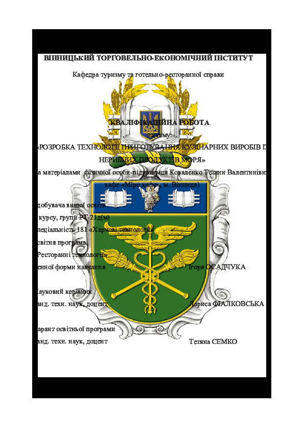 | Title: | Розробка технології приготування кулінарних виробів із нерибних продуктів моря (за матеріалами фізичної особи-підприємця Коваленко Тетяни Валентинівни, кафе «Міро кафе», м. Вінниця) |