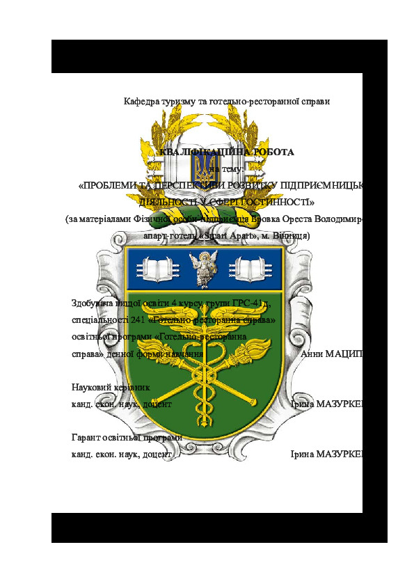 | Title: | Проблеми та перспективи розвитку підприємницької діяльності у сфері гостинності (за матеріалами Фізичної особи-підприємця Бровка Ореста Володимировича, апарт-готель «Smart Apart», м. Вінниця) |
