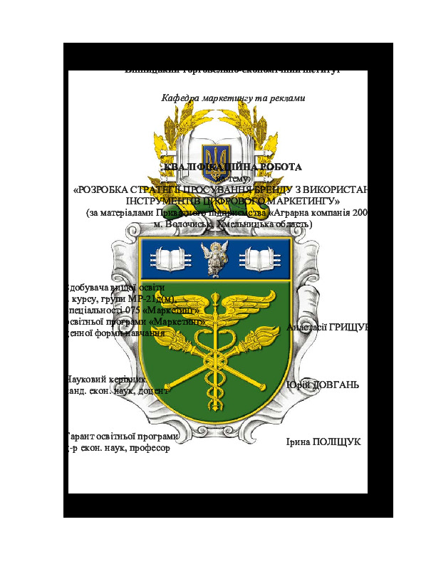 | Title: | Розробка стратегії просування бренду з використанням інструментів цифрового маркетингу (за матеріалами Приватного підприємства «Аграрна компанія 2004», м. Волочиськ, Хмельницька область) |