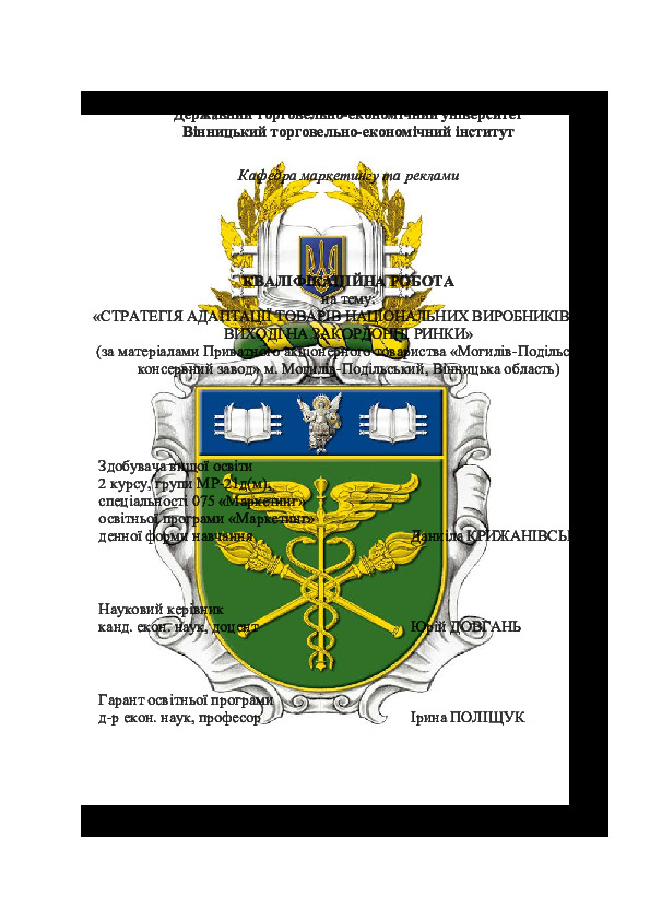 | Title: | Стратегія адаптації товарів національних виробників при виході на закордонні ринки (за матеріалами Приватного акціонерного товариства «Могилів-Подільський консервний завод» м. Могилів-Подільський, Вінницька область) |