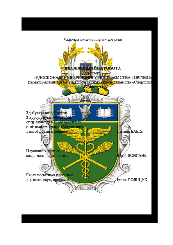| Title: | Удосконалення брендингу підприємства торгівлі (за матеріалами Товариства з обмеженою відповідальністю «Спортспейс», м. Вінниця) |