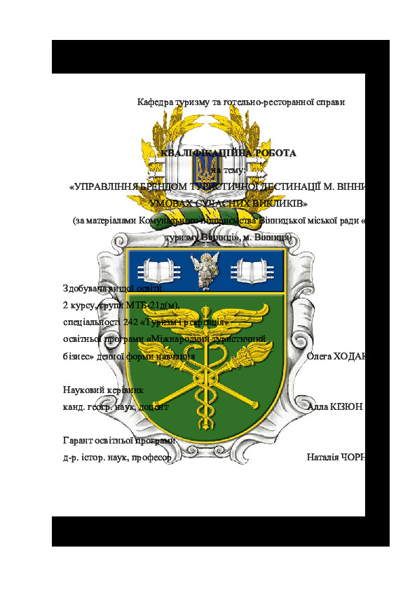 | Title: | Управління брендом туристичної дестинації м. Вінниці в умовах сучасних викликів (за матеріалами Комунального підприємства Вінницької міської ради «Офіс туризму Вінниці», м. Вінниця) |