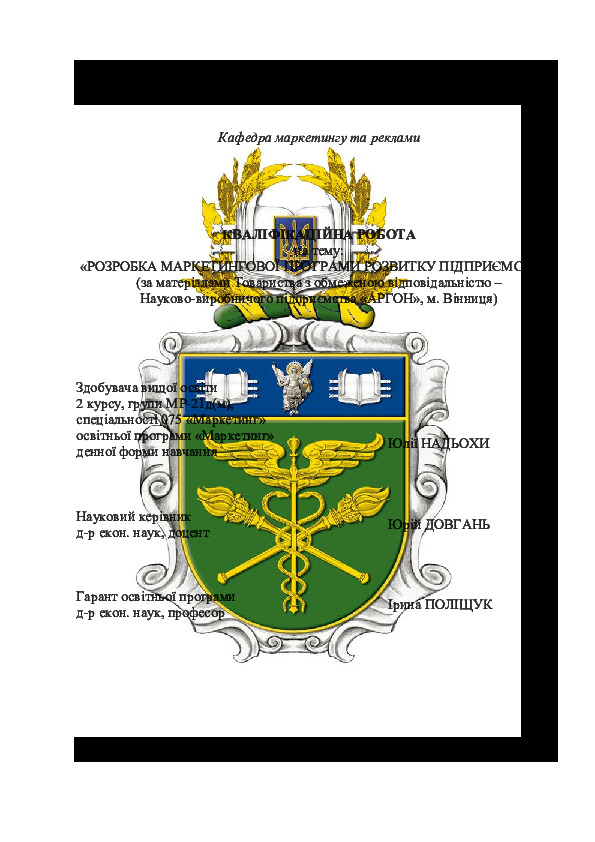 | Title: | Розробка маркетингової програми розвитку підприємства (за матеріалами Товариства з обмеженою відповідальністю – Науково-виробничого підприємства «АРГОН», м. Вінниця) |