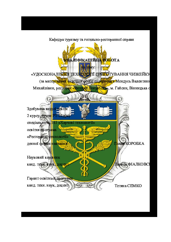 | Title: | Удосконалення технології приготування чизкейку (за матеріалами фізичної особи-підприємця Мендусь Валентини Михайлівни, ресторан «Винний Погрібець», м. Гайсин, Вінницька обл.) |