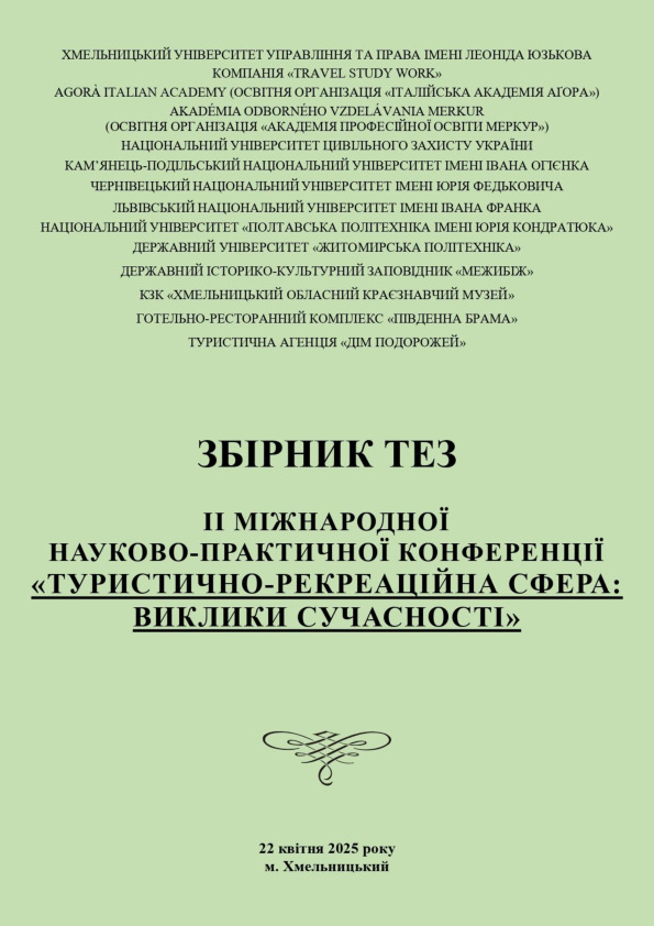 | Publication: | Туристично-рекреаційна сфера: виклики сучасності : зб. тез II Міжнар. наук.-практ. конф., м. Хмельницький, 22 квіт. 2025 р., Хмельницький : Хмельницький університет управління та права імені Леоніда Юзькова, 2025. С. 115–117. |