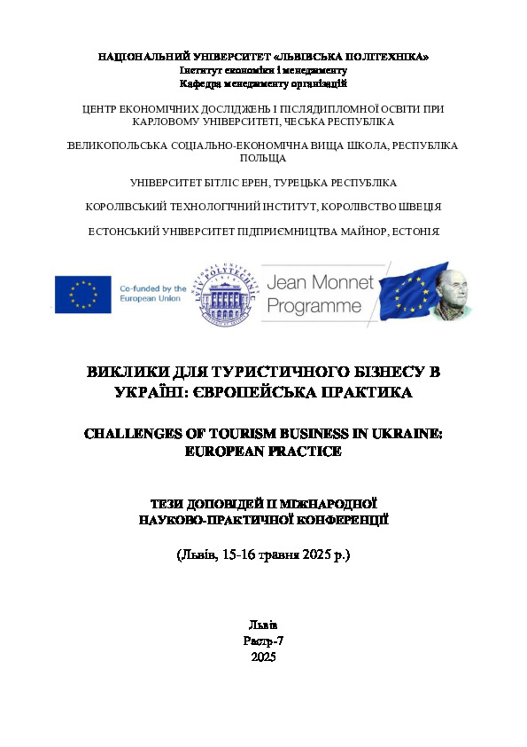 | Publication: | Виклики для туристичного бізнесу в Україні: європейська практика : тези доп. ІІ Міжнар. наук.-практ. конф., м. Львів, 15-16 трав. 2025 р., Львів: Національний університет «Львівська політехніка», 2025. С. 95–97. |