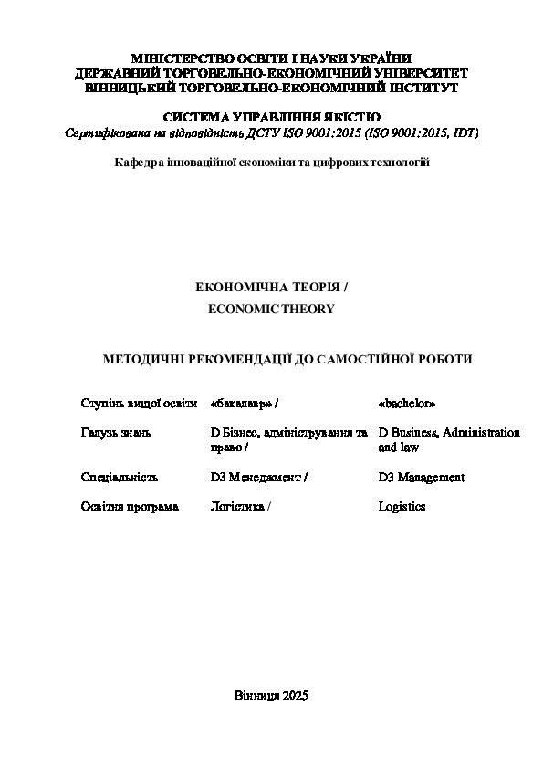 | Аннотація: | Економічна теорія є фундаментальним освітнім компонентом, виступає основою, на якій базується вивчення економічних освітніх компонент. «Економічна теорія» досліджує проблеми політекономії, у тому числі: економічні системи, відносини власності, теорії грошей; проблеми мікроекономіки, у тому числі: теоретичні аспекти ринкової економіки та ринкового механізму, проблеми доходів і заробітної плати, поведінку споживача, ефективність господарювання підприємств (фірм) в ринкових умовах. В освітньому компоненті «Економічна теорія» досліджуються проблеми макроекономіки, а саме: суспільне відтворення, економічне зростання, інфляція, безробіття та державне регулювання в умовах ринкової економіки. Розглядаються проблеми мезорівня - особливості дії економічних законів в аграрному секторі. Вивчаються проблеми мегарівня -закономірності розвитку світового господарства. Освітній компонент «Економічна теорія» містить концептуальні положення теоретичної економіки, які допоможуть здобувачам освітнього ступеня бакалавр освітньої програми «Логістика» з’ясувати суть і специфіку основних механізмів ринкової економіки, факторів, що впливають на мікро- та макро- процеси, методи та засоби економічного регулювання. |