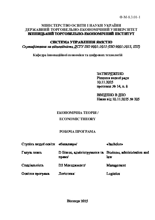 | Видавництво: | : робоча програма. Вінниця : Редакційно-видавничий відділ ВТЕІ ДТЕУ, 2025. 30 с. |