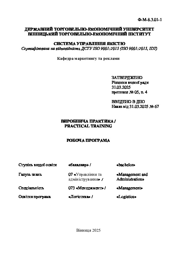 | Ключові слова: | логістика, виробнича практика, робоча програма |