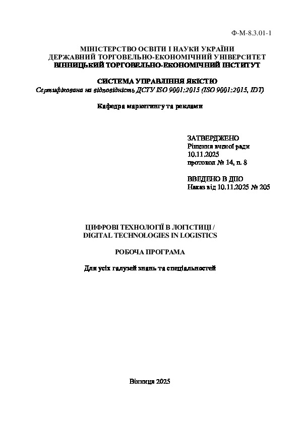 | Видавництво: | : робоча програма. Вінниця : Редакційно-видавничий відділ ВТЕІ ДТЕУ, 2025. 21 с. |