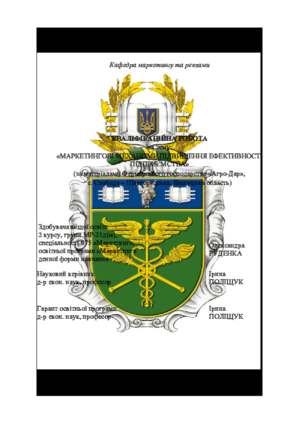 | Назва: | Маркетингові механізми підвищення ефективності підприємства (за матеріалами Фермерського господарства «Агро-Дар», с. Слобода – Шаргородська, Вінницька область) |