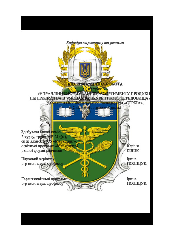| Назва: | Управління формуванням асортименту продукції підприємства в умовах конкурентного середовища (за матеріалами Фермерського господарства «СТРІЛА», с. Снітків, Вінницька область) |