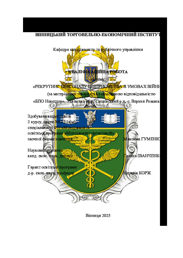 | Назва: | Рекрутинг персоналу підприємства в умовах війни (за матеріалами товариства з обмеженою відповідальністю «БПО Некстдор», Львівська обл., Сколівський р.н, с. Верхня Рожанка) |
