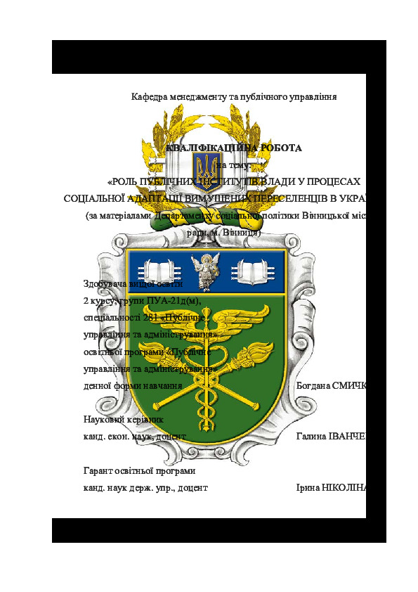 | Назва: | Роль публічних інститутів влади у процесах соціальної адаптації вимушених переселенців в Україні (за матеріалами Департаменту соціальної політики Вінницької міської ради, м. Вінниця) |