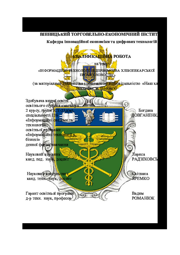 | Назва: | Інформаційні технології підприємства хлібопекарської промисловості (за матеріалами Товариства з обмеженою відповідальністю «Наш хліб Вінниця», м. Вінниця) |